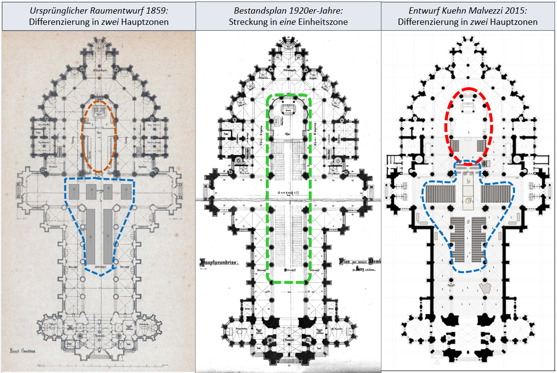 Mit dem Entwurf von Kuehn Malvezzi und Zobernig wird die Statz’sche Raumidee erstmals, aber in gegenwärtiger Interpretation umgesetzt: Die Differenzierung der beiden Zonen geschieht dabei nicht gemäß der „ständischen“ Über- und Unterordnung des 19. Jahrhunderts (Laienkirche / Klerusbereich), sondern folgt der heutigen funktionalen Bestimmung: Im Vierungsbereich ist die Feier der Eucharistie verortet; der dahinter liegende, bis ins historische Presbyterium reichende Raum ist für das Stundengebet (Vesper, Laudes etc.), Meditationen und andere mögliche Liturgien bestimmt.