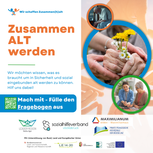 Das Thema "Alt werden" beschäftigt viele Menschen, auch in der Region Vöckla-Ager. Das Projekt "Zusammen(h)alt" möchte herausfinden, welche Angebote und Unterstützung die ältere Generation braucht, um in Sicherheit und sozial eingebunden alt werden zu können. Gemeinsam mit dem Sozialhilfeverband Vöcklabruck, dem Maximilianhaus und der Sterbebegleiterin Elisabeth Kienberger will die LEADER-Region Vöckla-Ager mit dem Projekt die Situation beleuchten und daraus passende nächste Schritte und Projekte ableiten. Für die Befragungen wurde die Private Pädagogische Hochschule der Diözese Linz mit ins Boot geholt.