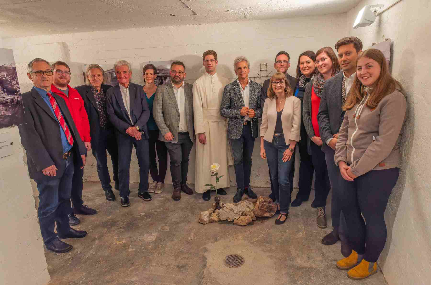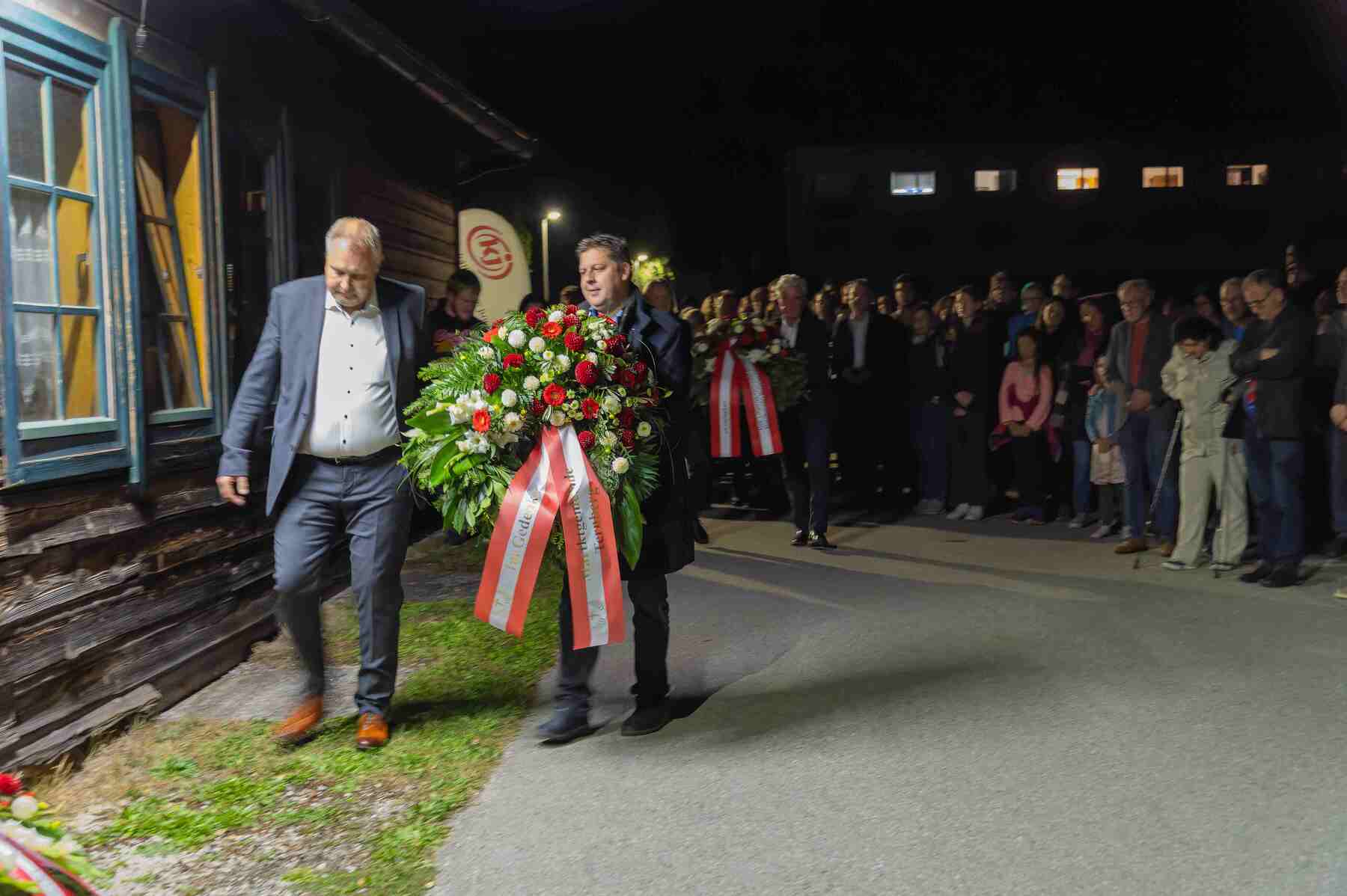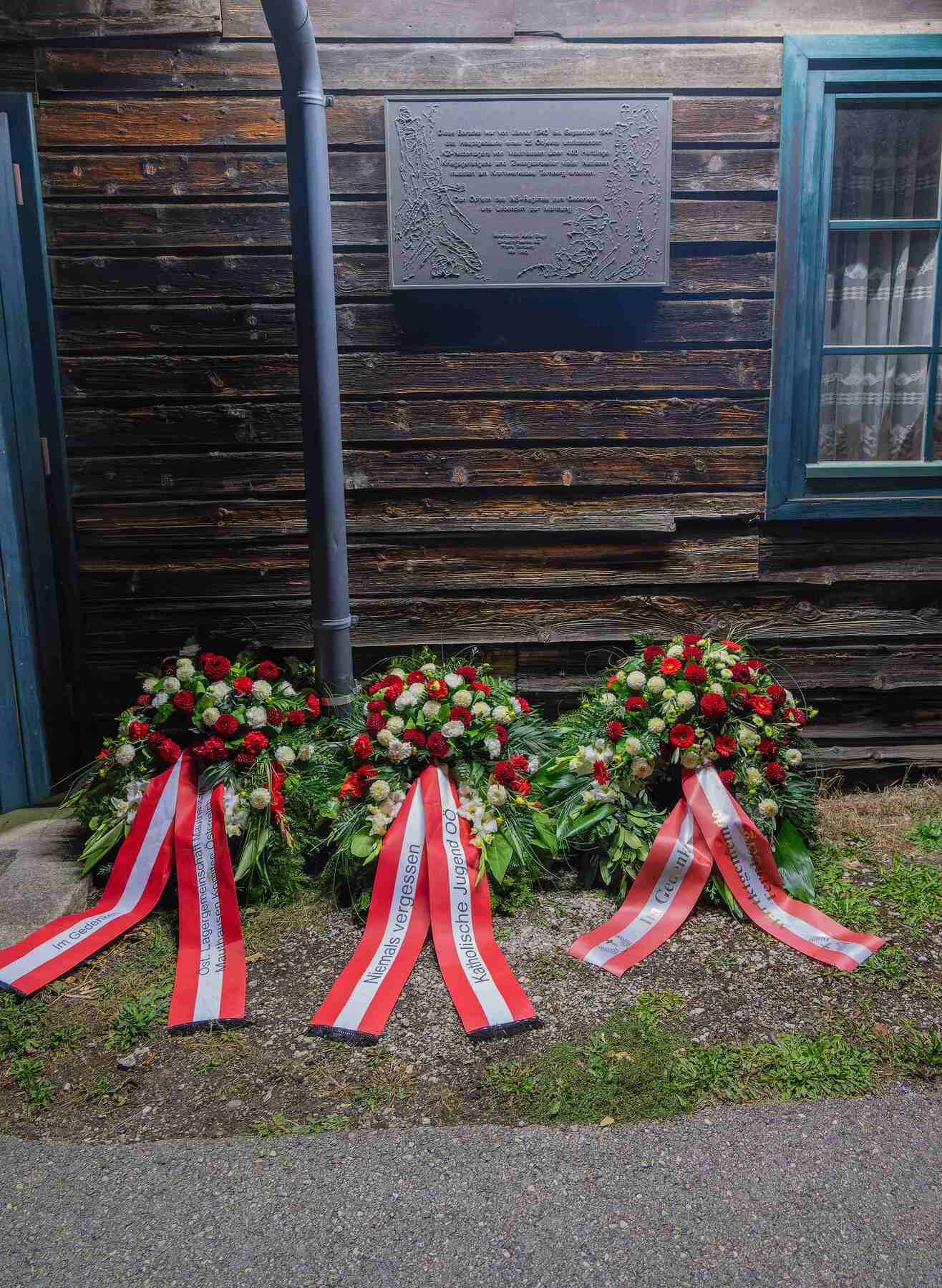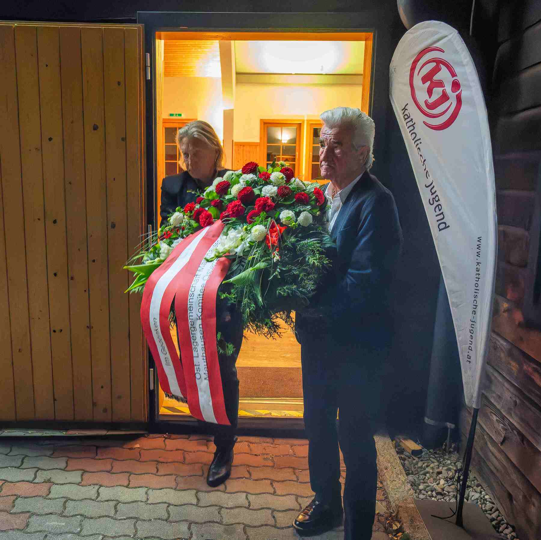Diözesanjugendseelsorger Vitus Glira und Pfarrer Friedrich Lenhart sprachen ein Gebet. Zum Abschluss wurden vor der Pfarrbaracke Kränze niedergelegt.
