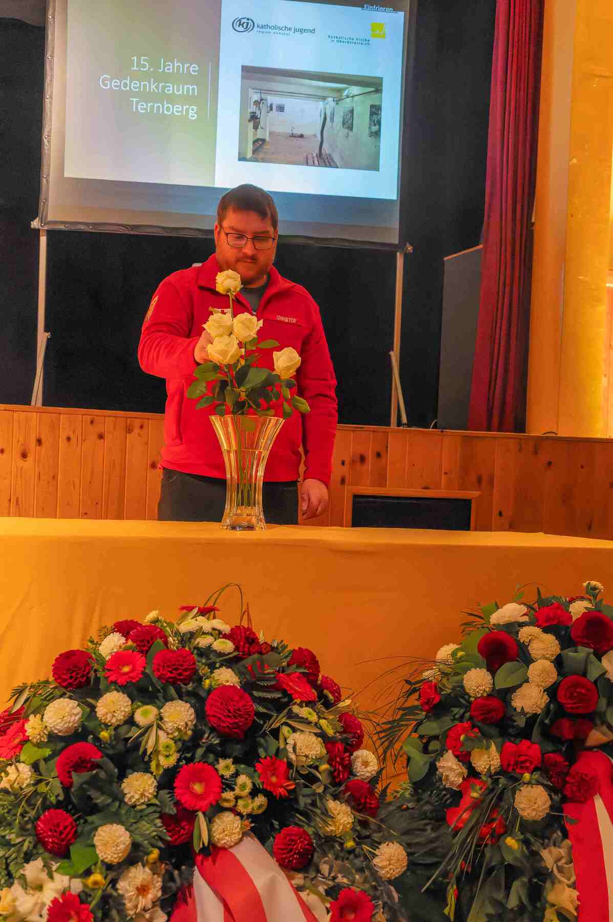 Historiker Adolf Brunnthaler hat vor 15 Jahren an der Entstehung des Gedenkraums Ternberg mitgewirkt. In seinem Grußwort wies er darauf hin, dass sich die Gedenkstätte Ternberg in eine „Kette von Erinnerungsperlen“ einreihe, die in den letzten Jahrzehnten entstanden sei: „Die Gedenkstätte in Weyer-Dipoldsau mit ihren Gedenkfeiern seit 2001, das KZ-Denkmal im Kreisverkehr von Großraming – eines der ersten seiner Art – und der Gedenkraum in Ternberg mit seiner Erinnerungskultur“. Brunnthaler dankte den Jugendlichen, die vor 15 Jahren die Gedenkstätte Ternberg während der „72 Stunden ohne Kompromiss“ gestaltet hatten: „Ihr könnt stolz darauf sein, was aus diesen ersten ‚72 Stunden‘ geworden ist“. Der Katholischen Jugend der Region Ennstal sprach er seinen Dank für die jahrelange ausgezeichnete Zusammenarbeit aus.