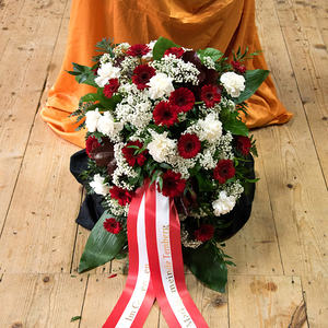 Im weiteren Verlauf der Feier wurden die bekannten Namen der Opfer des KZ-Außenlagers Ternberg verlesen und Dechant Friedrich Lenhart sprach ein Gebet. Zum Abschluss wurden vor der Pfarrbaracke Kränze niedergelegt.